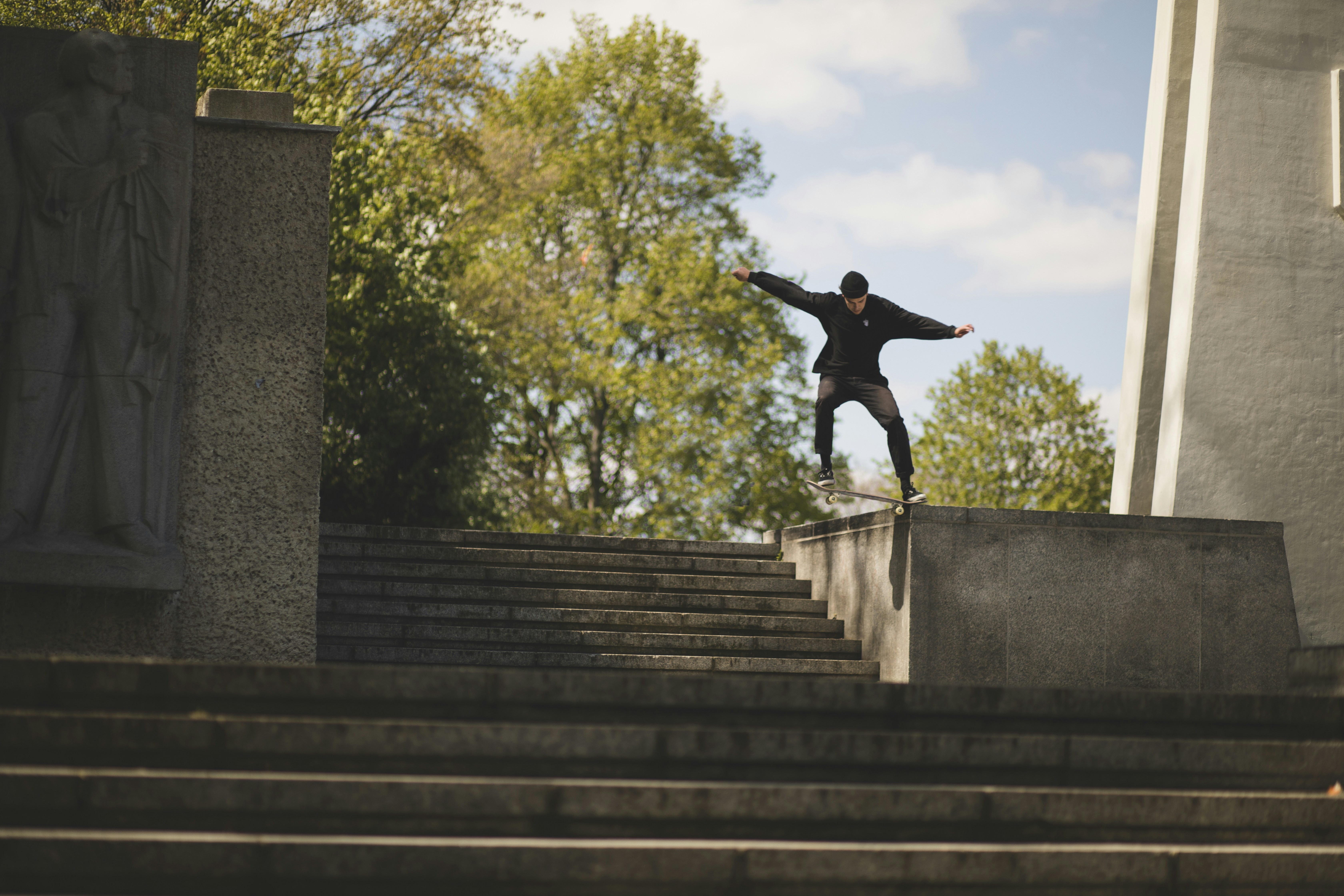男人,男人,白种人,台阶,混凝土,树木,滑板,平衡,户外,光,夏天,街道,滑板