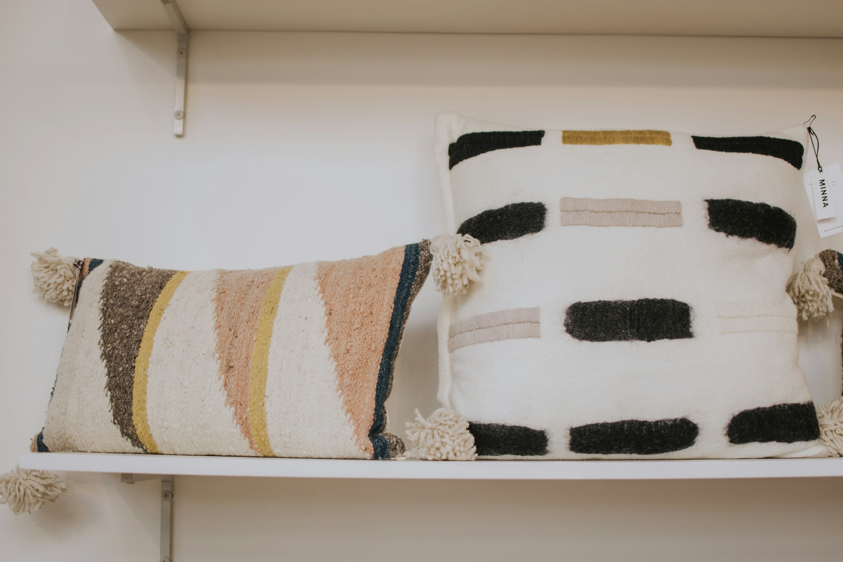 A minimalist shot of a woven laundry basket next to a chair against a white backdrop.