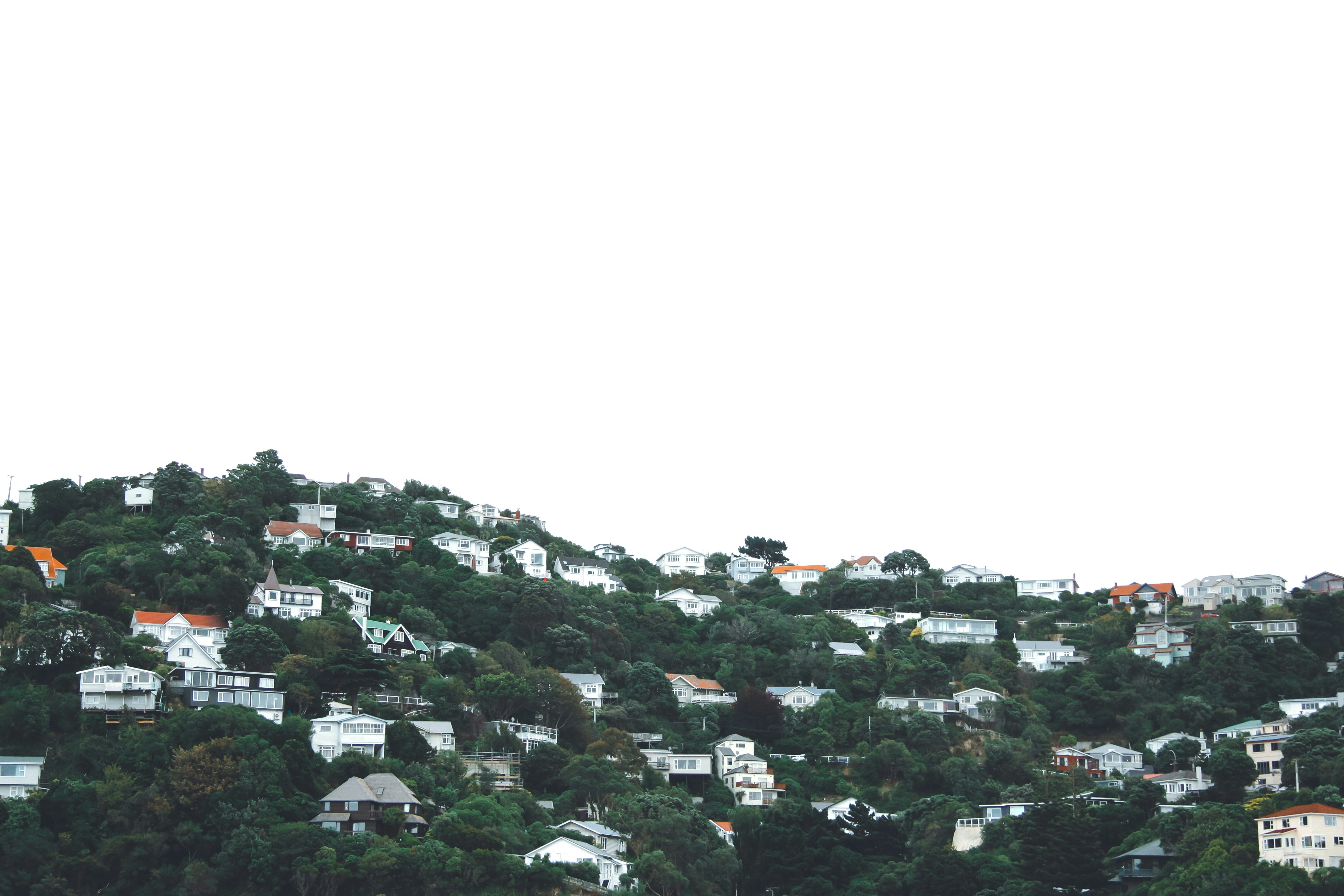 建筑物,山,森林,树木,绿色,天空,明亮,丘陵,对比,屋顶,房子,新西兰,白色天空,白色,白色的房子,丘陵,山顶,惠灵顿