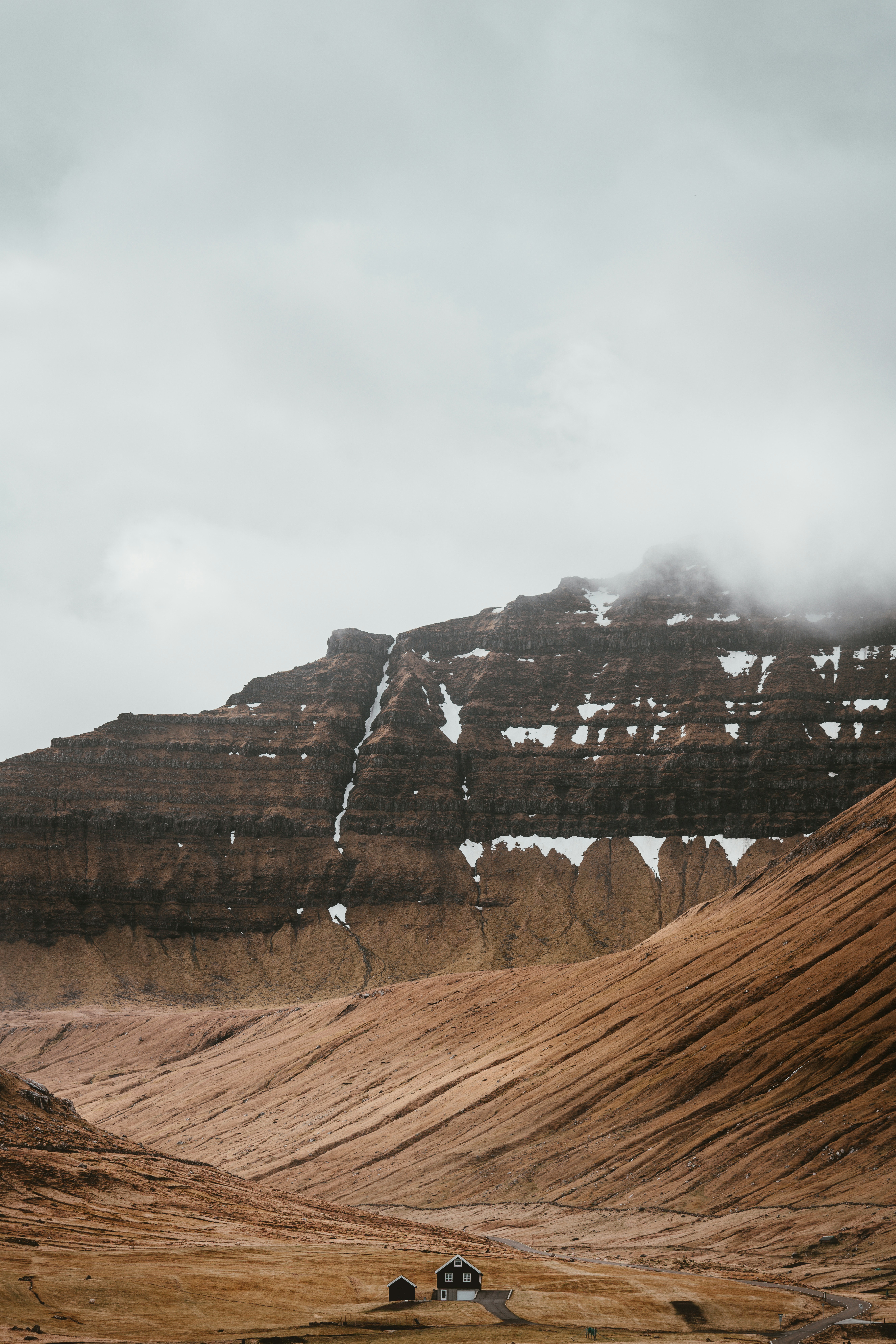 mountain,valley,building,house,cloudy,storm,ridge,brown,gjógv,snow