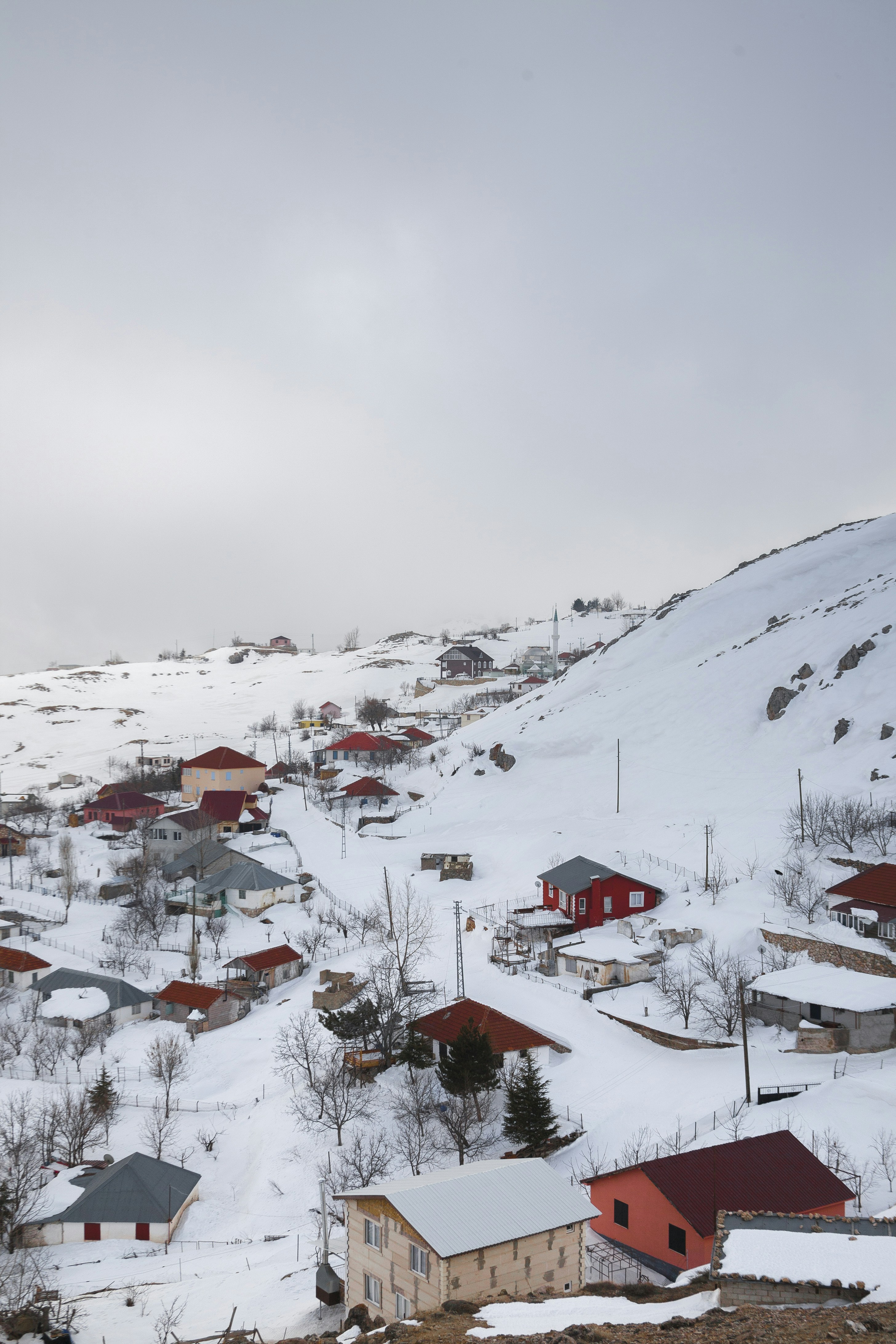 雪、冬、山、山、楼、城、街、树、云、雾、白