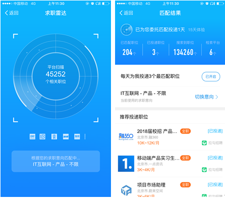 同时,趣校园通过“岗位搜索雷达”每天把用人单位和大学生的岗位需求更精准地匹配。不仅能显示出匹配后的职位数量,并且筛选出最精准的3个职位,经用户授权后,自动投递到背后的企业。在平台展示上,更是“千人千面”,大一到大四显示的页面完全不同。