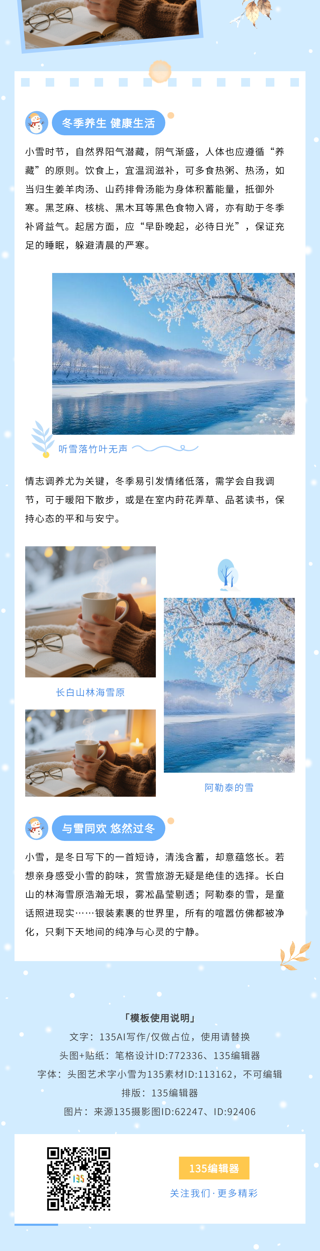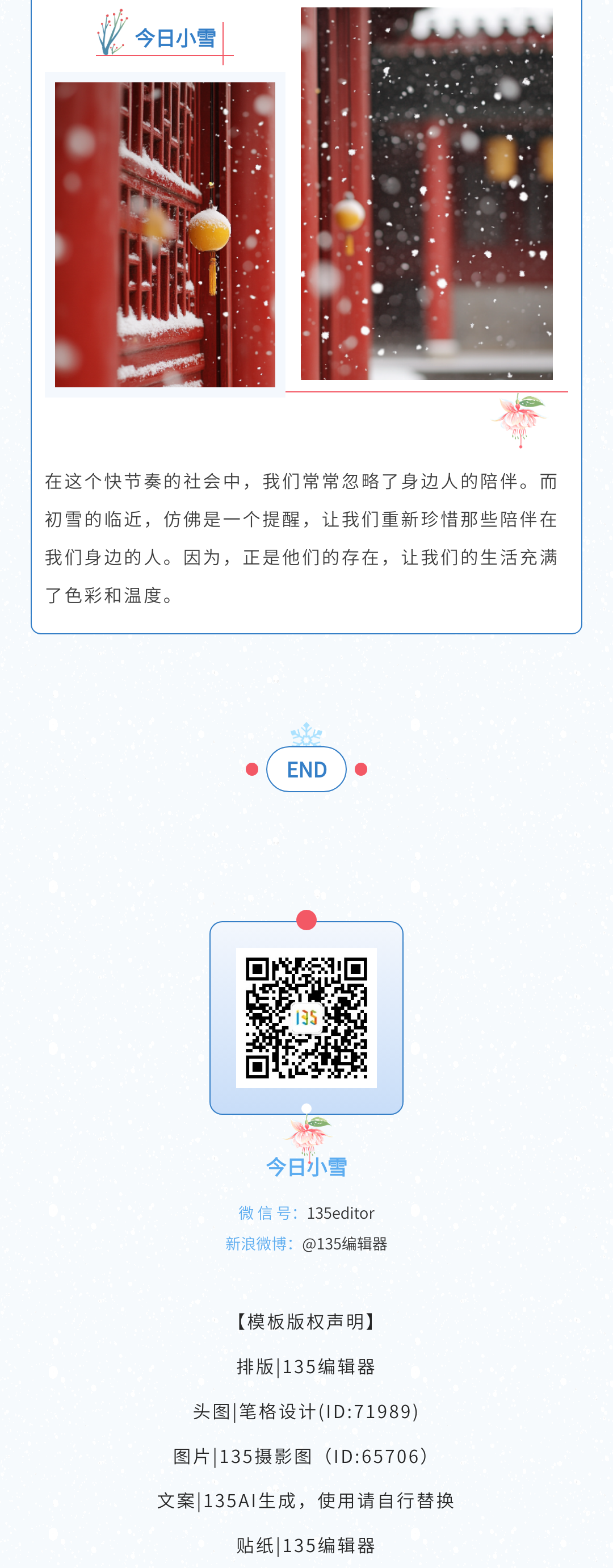 小雪文案没灵感?我们为你整理了《人民日报》的经典小雪文案和金句,并精选多款135编辑器小雪模板,附具体ID,一键套用,快速出稿。