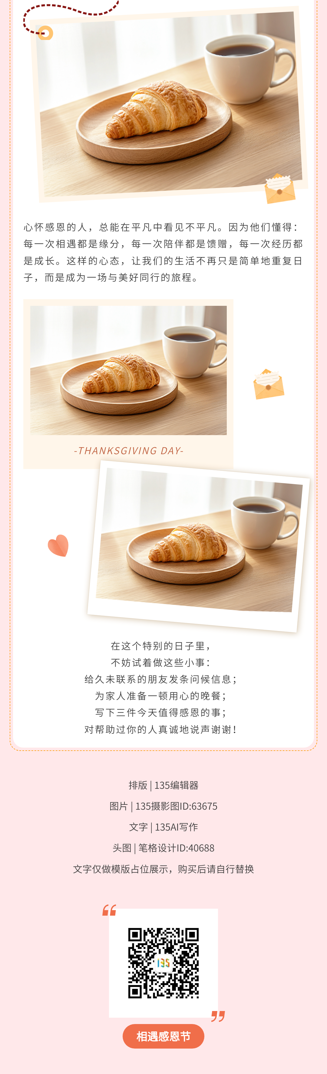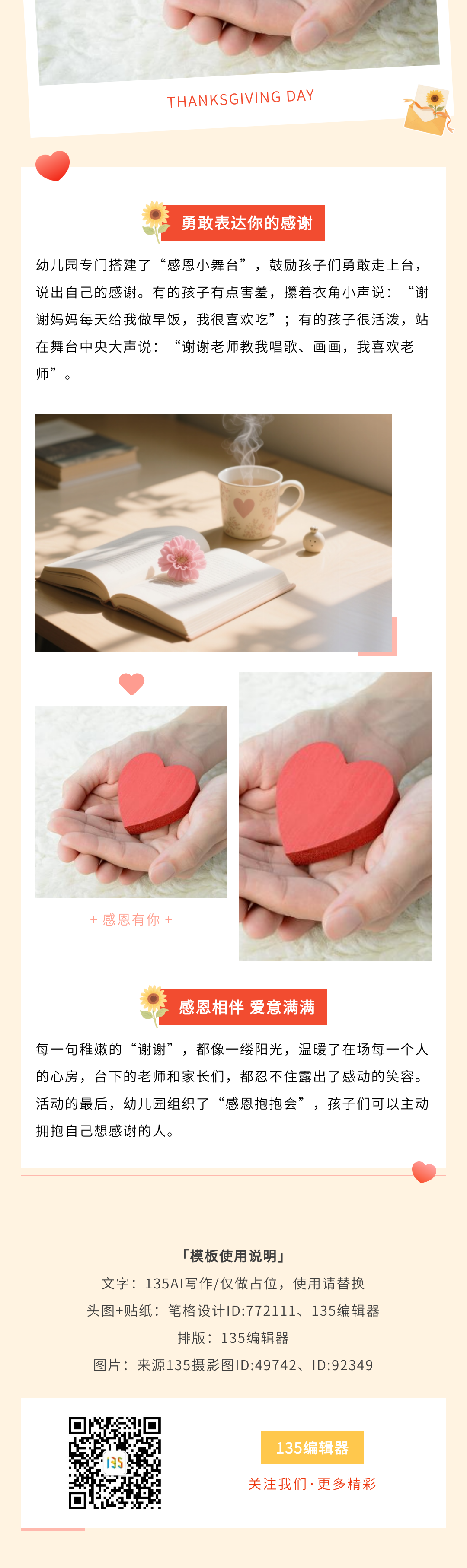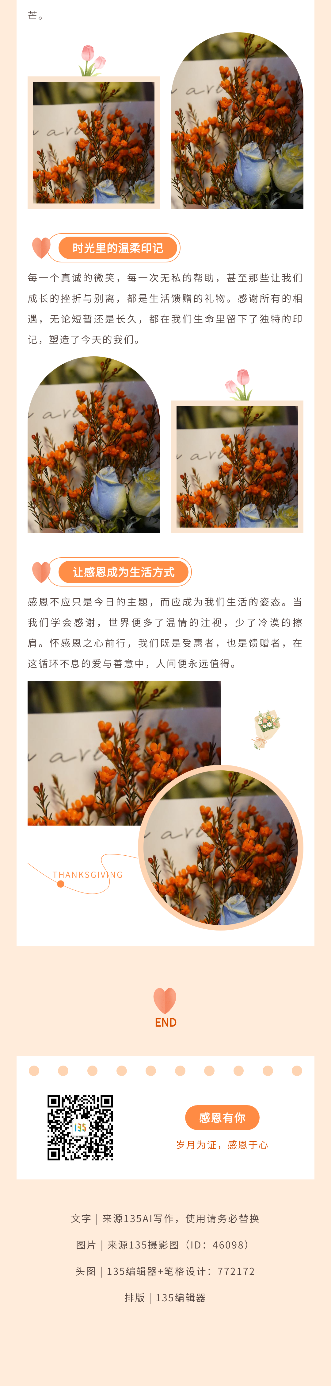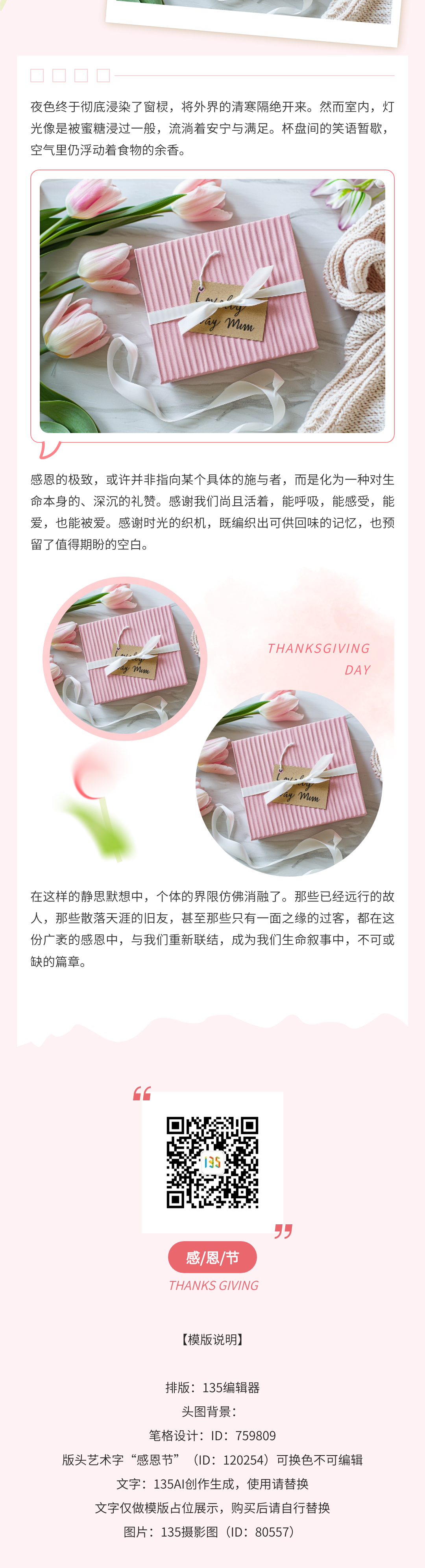 收获爱与感动,用设计表达感谢!135编辑器提供多款走心感恩节公众号模板,内含央视新闻温馨文案,助您打造情感真挚的节日推文,传递感恩力量。