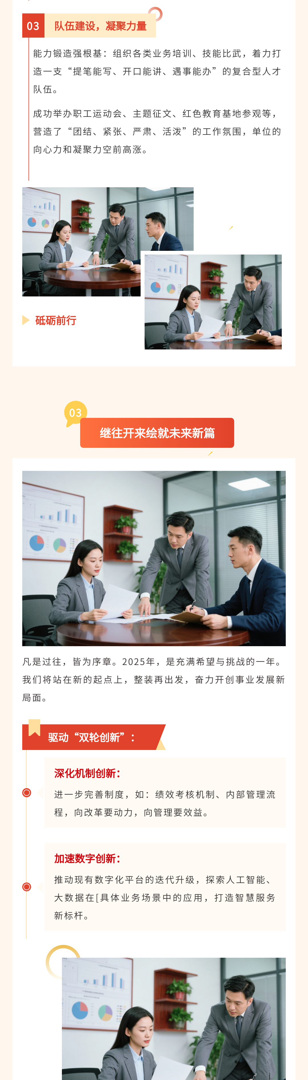 03.时光宛若潺潺流水,而奋斗则为其增添了璀璨的光芒。回首2025年,在领导的英明指导与同事们的全力支持下,我圆满完成了年度各项任务,赢得了广泛的认可。这一年,我在思想观念、工作实践以及学习生活中均实现了质的飞跃,深刻体会到集体智慧的力量。同时,我也正视自身的不足,现将工作总结如下……