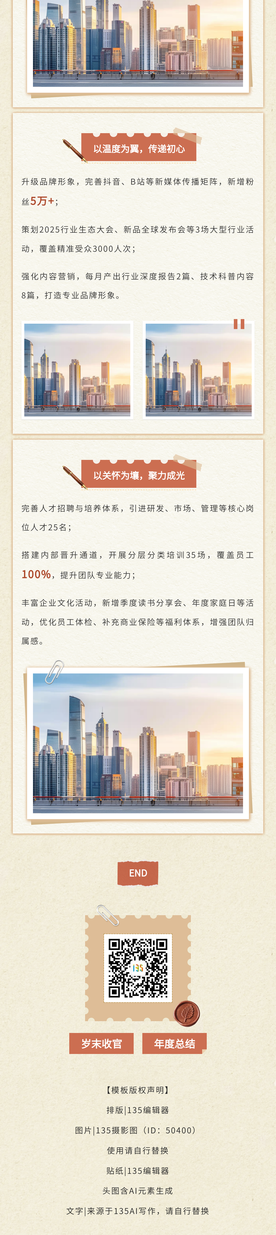 内含央视新闻等权威文案案例,提供超过10种年终总结经典开头结尾句和8套135编辑器公众号模板,让你的2025年总结既有文采又有颜值。马上收藏使用!