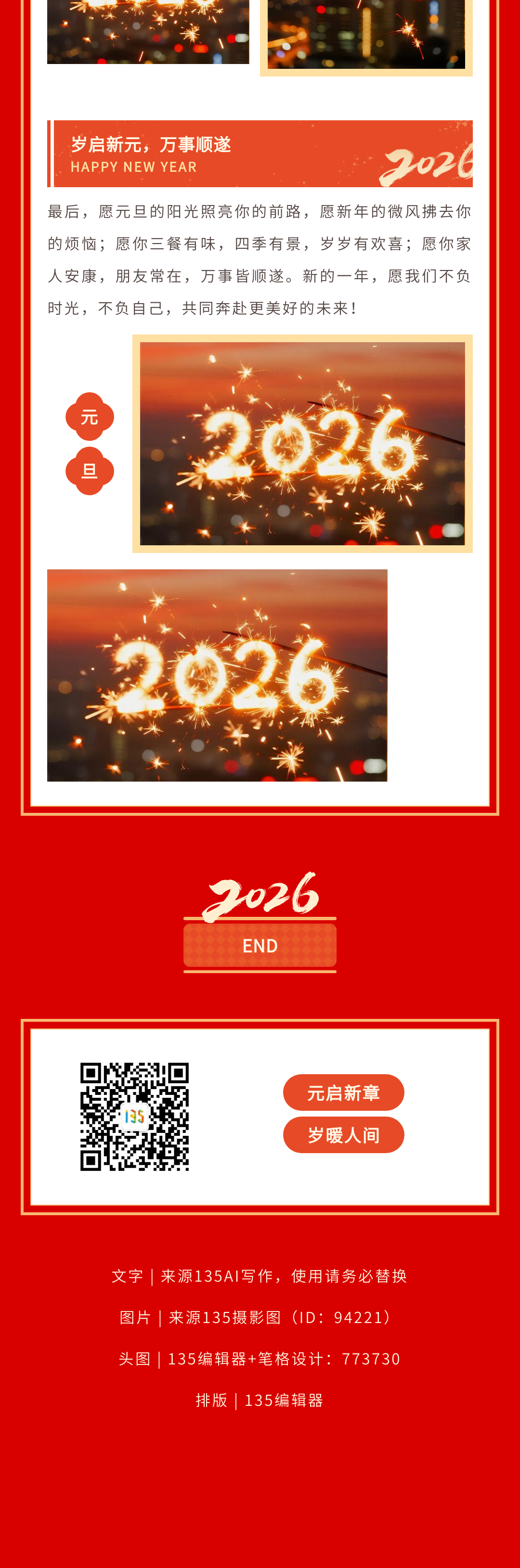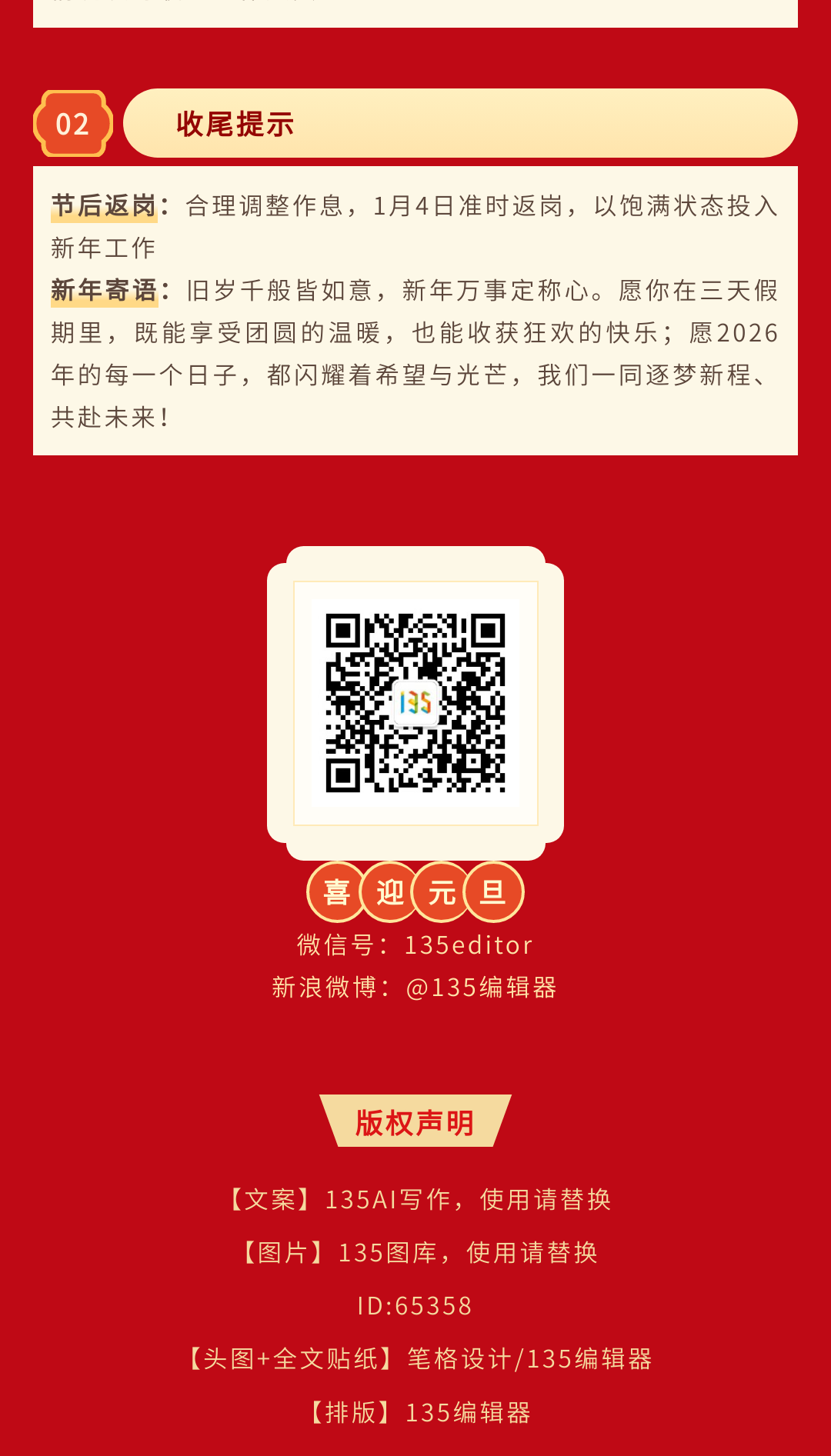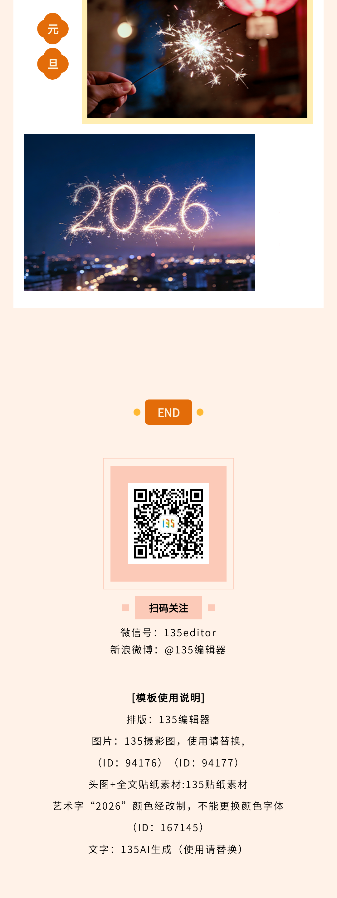 还在为元旦推文排版发愁?135编辑器整理2026年元旦新年祝福、放假通知、跨年活动、校园庆典及购物促销等多场景海量模板与SVG素材,输入模板ID即可快速套用,助你高效打造节日氛围,提升推文质感!