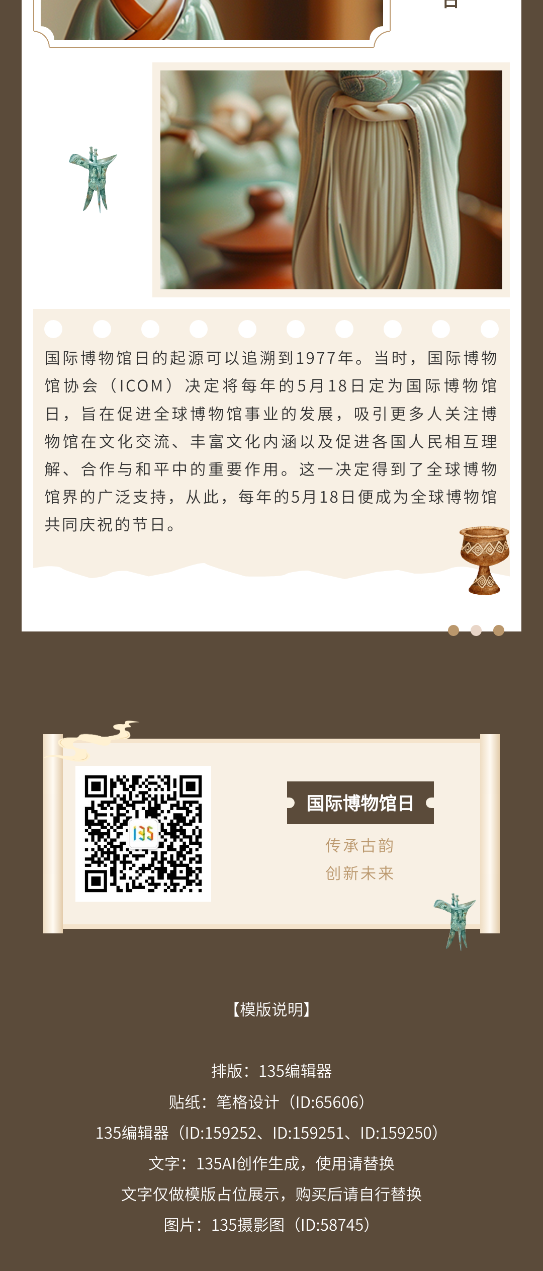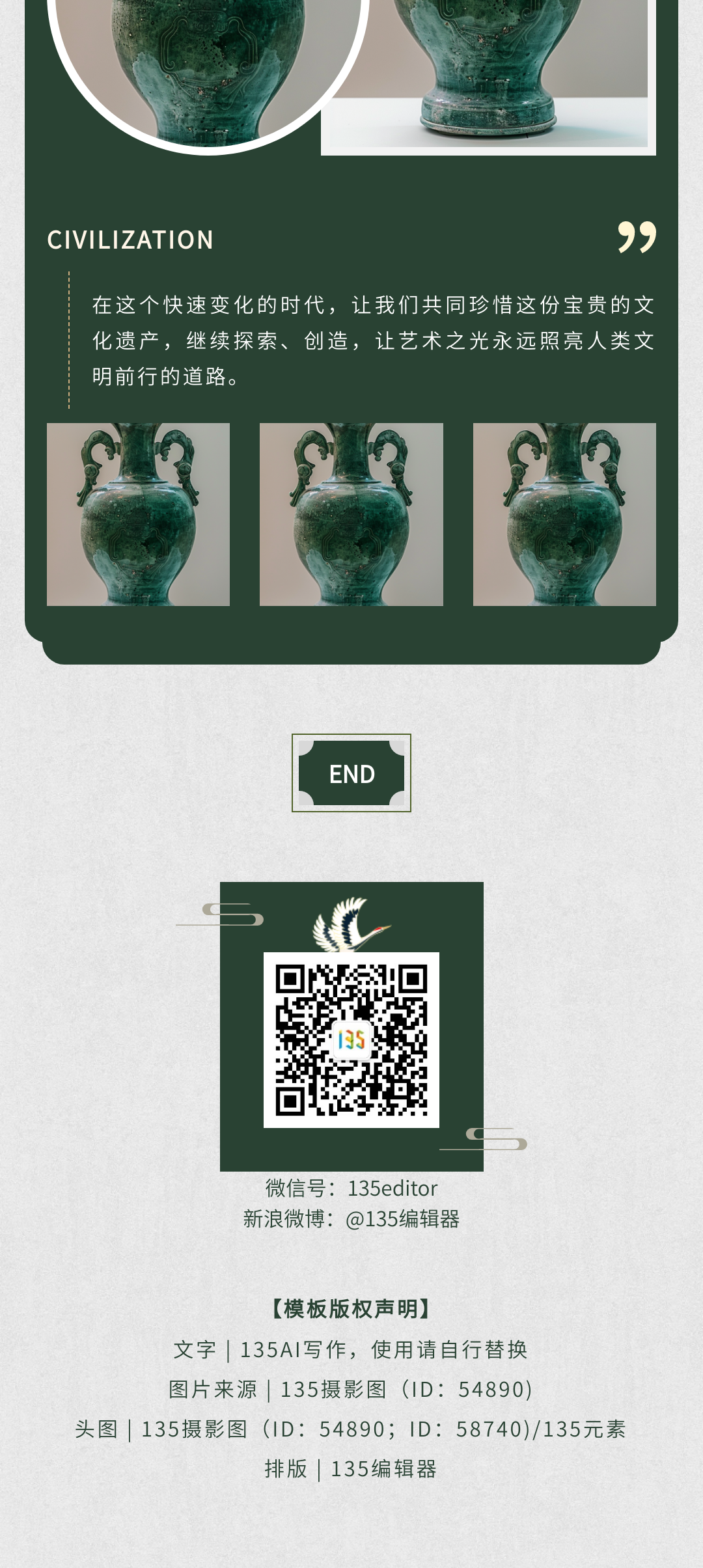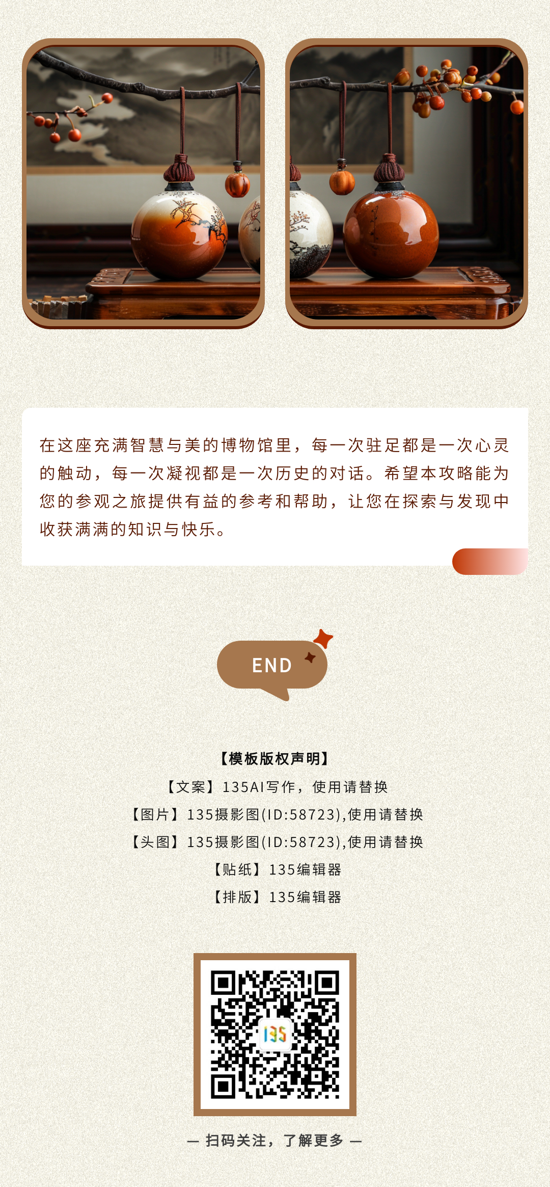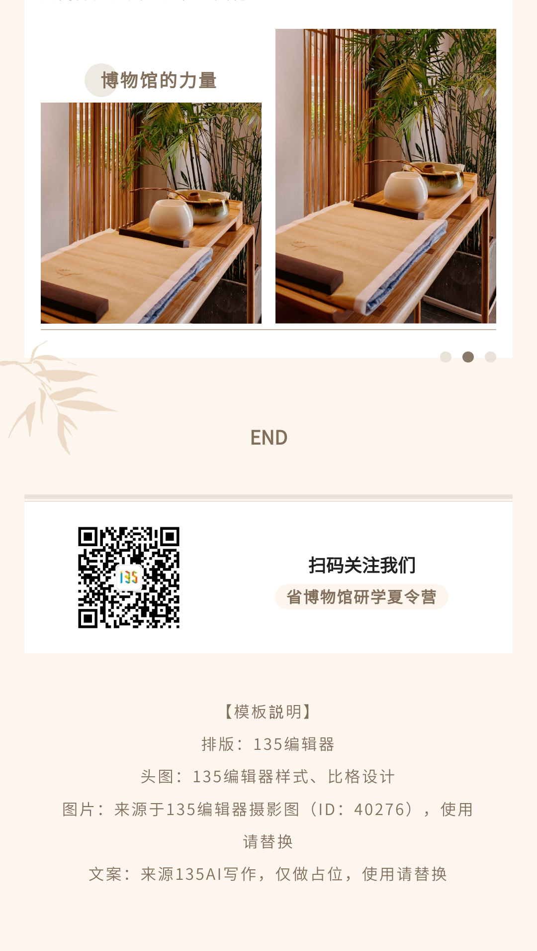 正在为博物馆展览、非遗活动或文物科普推文排版发愁?135编辑器为您精选多套专业博物馆模板,涵盖特展、书画、非遗、研学等全场景。一键套用,轻松制作出惊艳的公众号推文,提升文化宣传质感。立即搜索模板ID,获取专属排版方案!