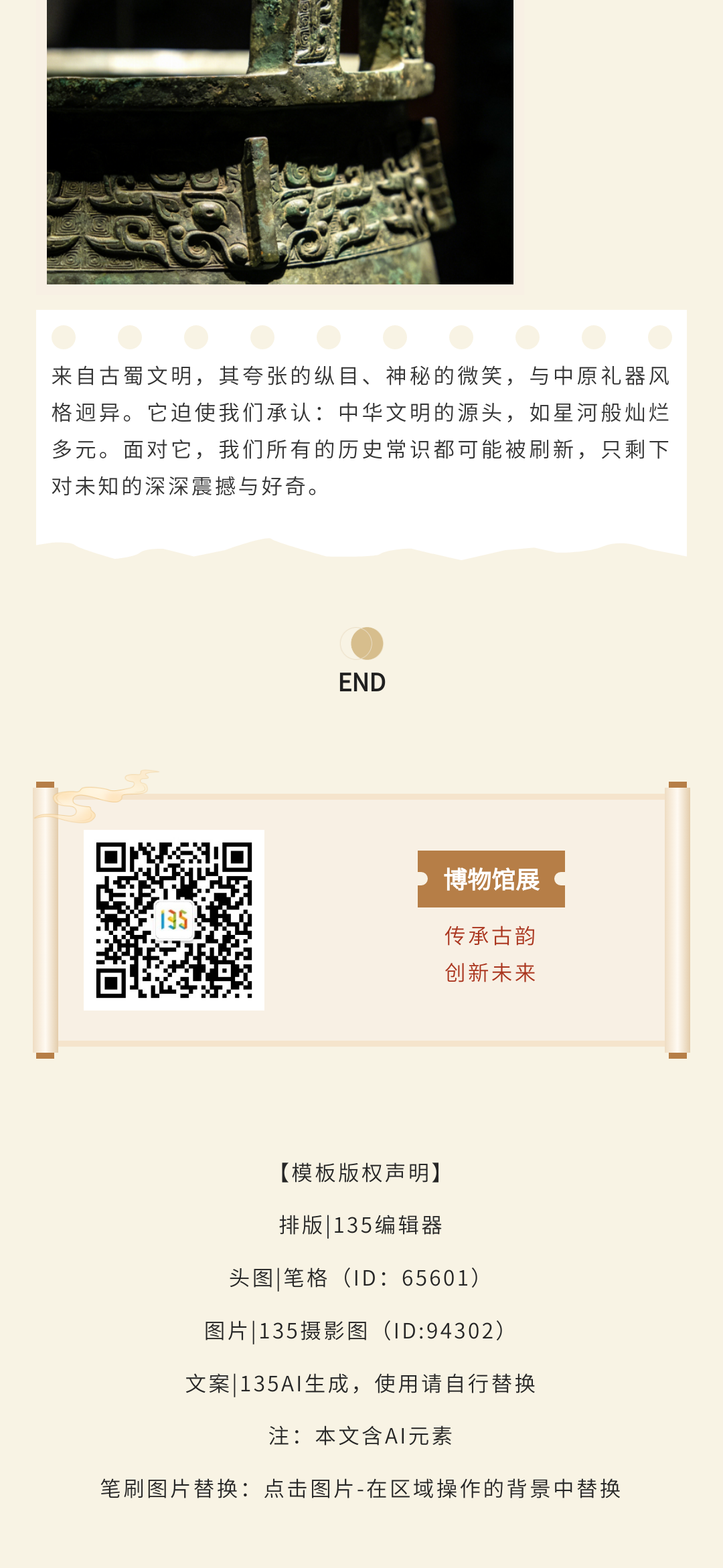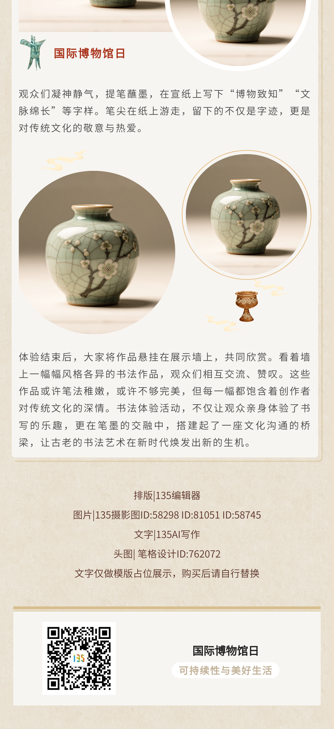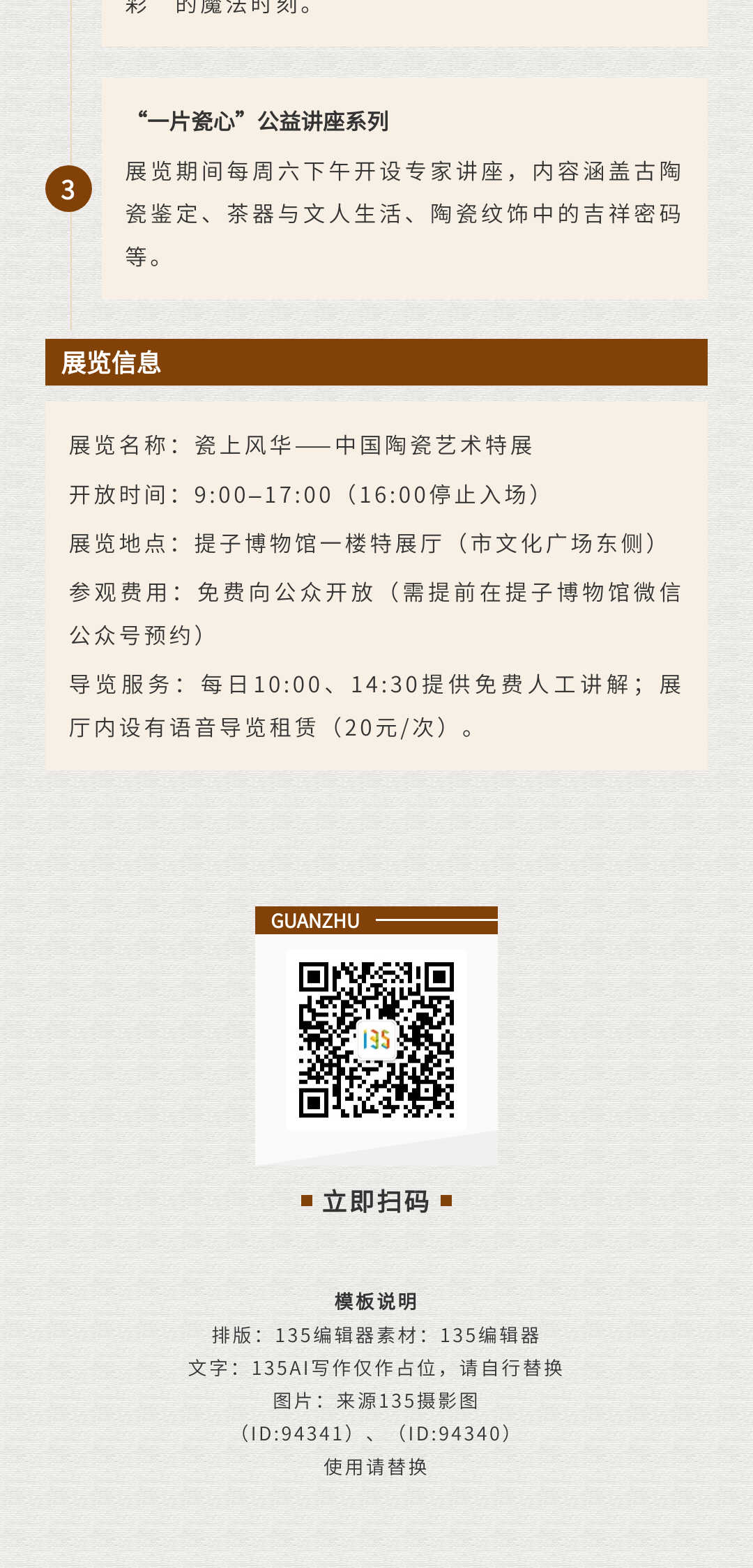 正在为博物馆展览、非遗活动或文物科普推文排版发愁?135编辑器为您精选多套专业博物馆模板,涵盖特展、书画、非遗、研学等全场景。一键套用,轻松制作出惊艳的公众号推文,提升文化宣传质感。立即搜索模板ID,获取专属排版方案!