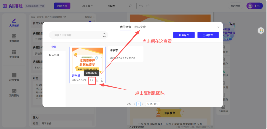 Step2:生成排版文章后,点击【复制到团队】按钮