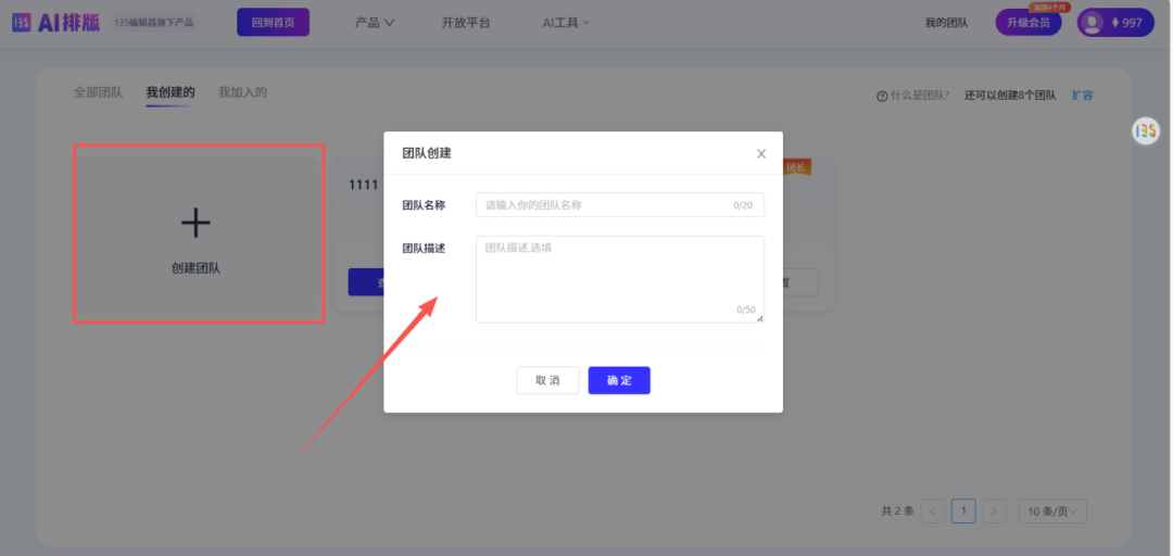 Step1:登录135AI排版,创建团队或加入已有团队,简单几步完成团队搭建