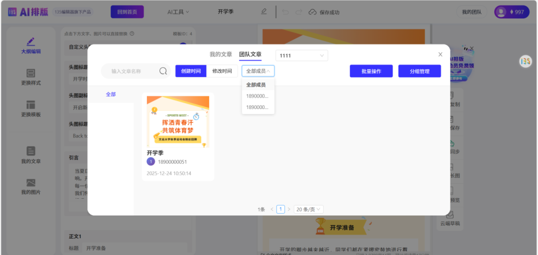 135AI排版团队版可完美解决这些问题:所有“复制到团队”的推文都会直接共享保存,无需额外操作,同时能清晰显示每篇团队文章的创建成员。团队成员可直接参考共享的推文对齐排版风格,新人也能借助这些共享推文快速熟悉团队输出标准,既保证了品牌调性的一致性,也让团队推文管理更清晰高效。
