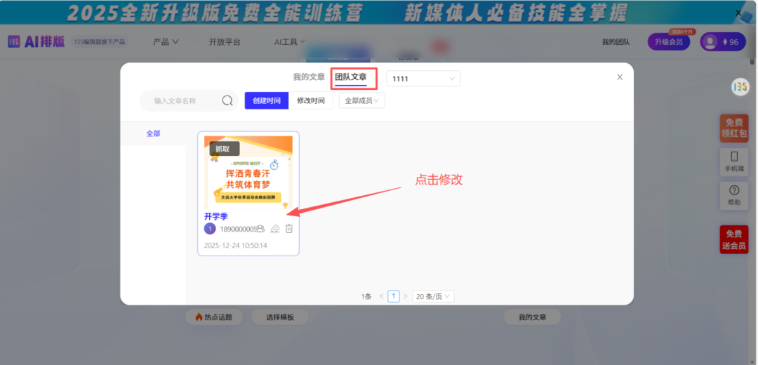 Step3:团队成员在“我的文章-团队文章”中查看/修改,轻松实现高效协作。