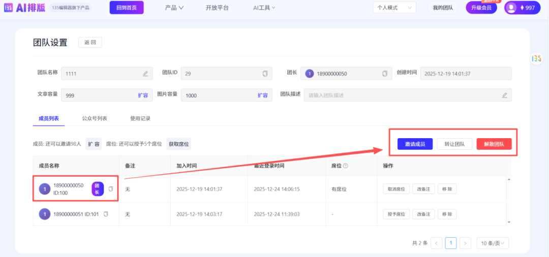 有席位成员:拥有团队核心管理权限与资产控制权,可直接邀请成员加入、解散团队,更支持一键转让团队——转让过程中,团队内所有共享推文、排版记录等核心资产将完整留存并无缝继承,彻底解决因负责人变更导致的资产流失问题,轻松适配人员调整,保障协作与资产沉淀的连贯性;同时仍享有原有核心管理权益,实现团队管理与资产管控双重保障。