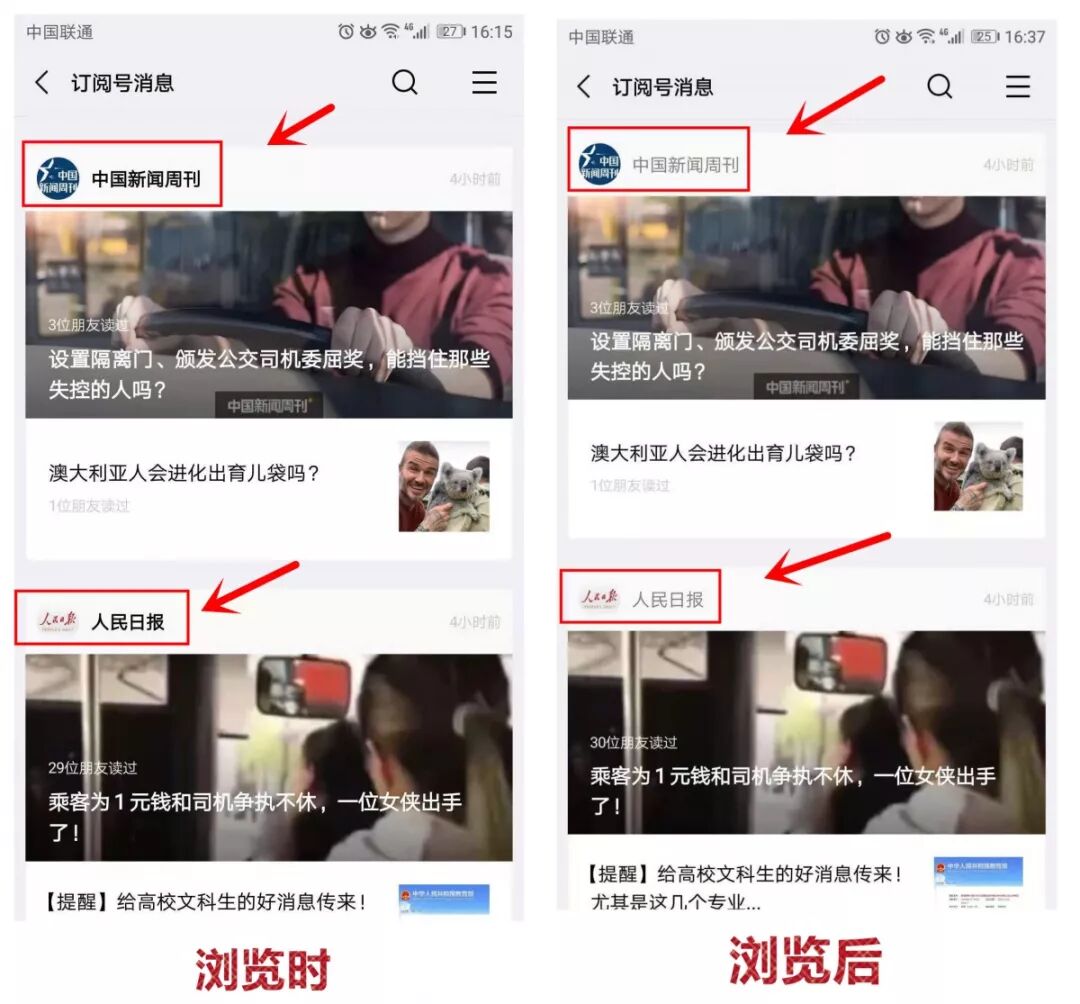 可能是微信良心发现,信息流对不少公众号的阅读量冲击较大,所以在订阅号入口改了一点小细节:由于信息流是按照推文时间排列公众号卡片,因此当你第一次浏览订阅号推文的时候,公众号名字是加粗的,这一点主要是提示你这个公众号刚刚更新了,但是,当推文划过屏幕之后,加粗取消。