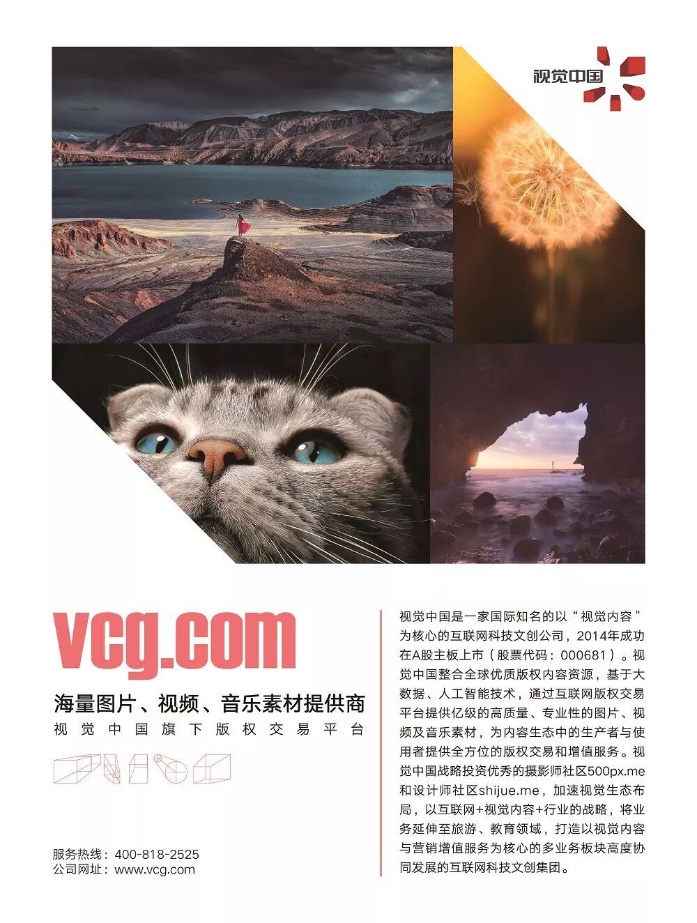 功能描述:视觉中国整合全球优质版权内容资源,基于大数据、人工智能技术,通过互联网版权交易平台提供亿级的高质量、专业性的图片、视频及音乐素材,为内容生态中的生产者与使用者提供全方位的版权交易及增值服务。