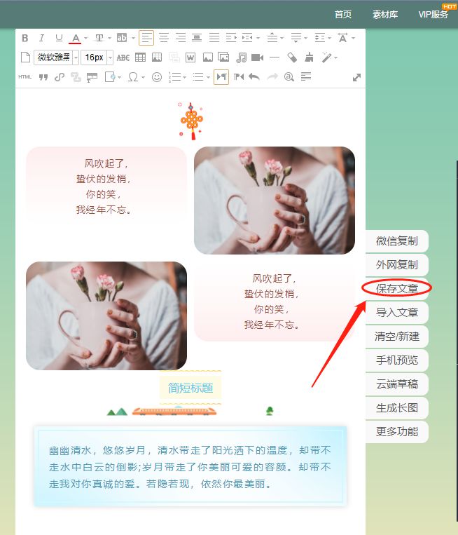 ▼点击编辑栏右侧菜单【保存文章】