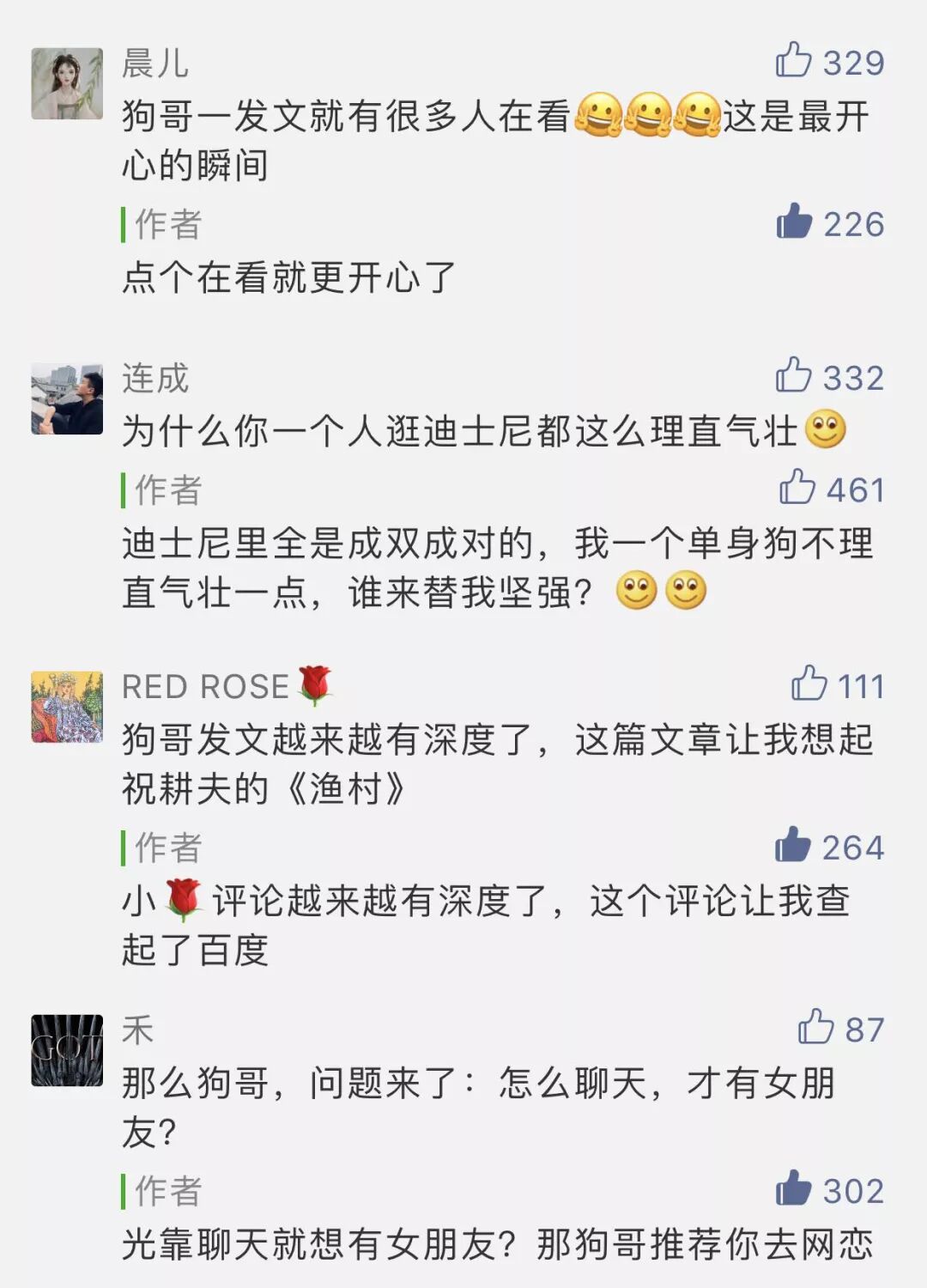 这种潜移默化的力量是极为强大的。我们可以看到,图文升级后的「有趣青年」账号在文章开头虽然少了那句熟悉的开场白,但在留言区我们依然可以大量粉丝为“狗哥”打call,甚至很多新用户还会与老用户互动,深扒“狗哥”历史,在这一来一回中,账号人格形象的影响又得到进一步放大。