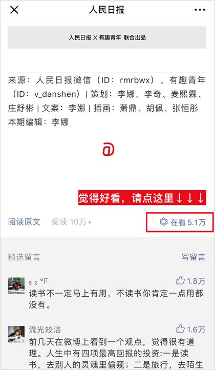 5 天后,「有趣青年」与「人民日报」又联合出品了一篇以“世界读书日”为主题的推文——《“读书其实没有什么用”》,文章在「人民日报」公众号发布 30 分钟后点赞迅速过万,72 小时点赞数更达到 4.8 万之高。