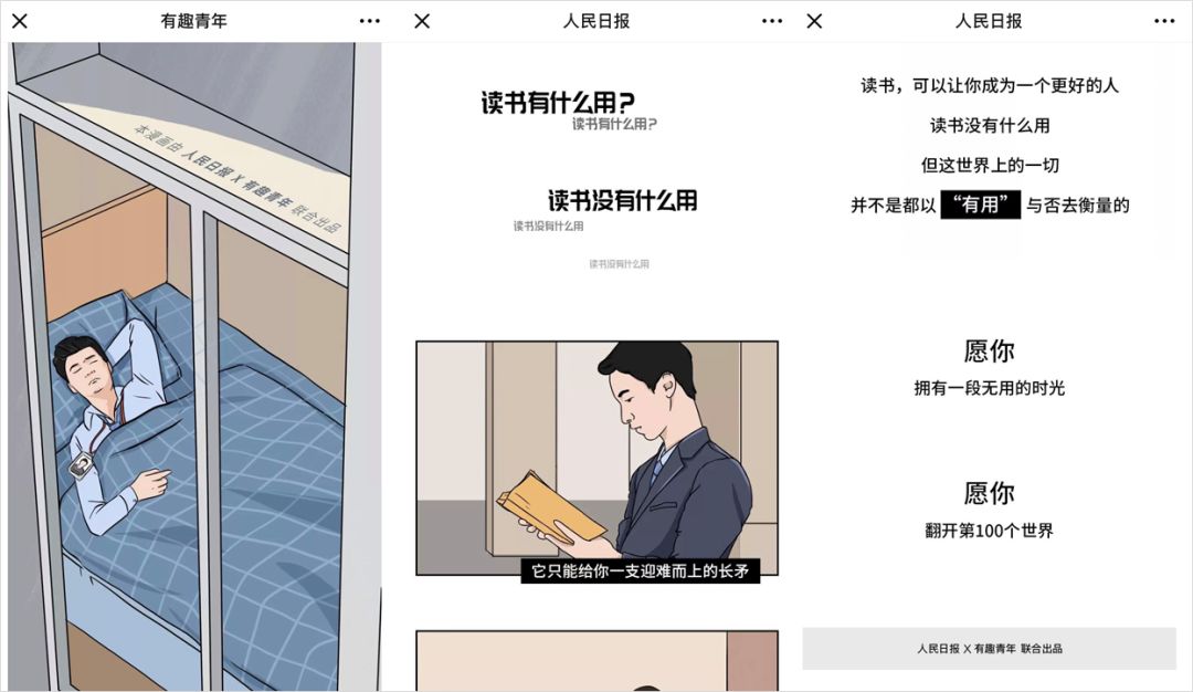 比如最近联合人民日报出品的这篇《“读书其实没有什么用”》,通过三个鲜活的故事旗帜鲜明地反击“读书无用论”,并且号召大家一起读好书;