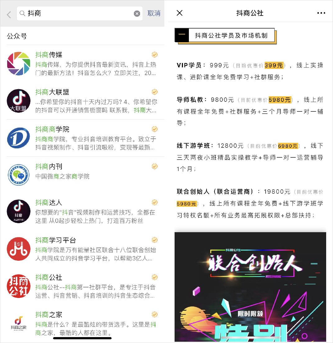 有一些机构,自己手下的账号也就几万粉,连小 V 都算不上,就出来割韭菜了;更有甚者,直接买了别人家的千万粉丝大号来为自己的培训做背书。