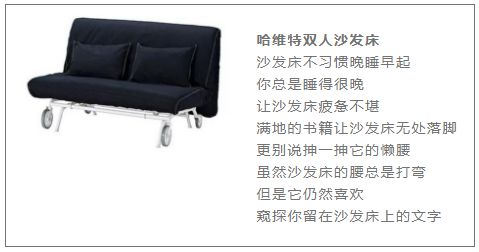 比如2010年宜家与青番茄图书馆跨界合作的一系列文案,这一组产品文案不仅仅是介绍产品,还在用一个个具体场景引发消费者的情绪共鸣。