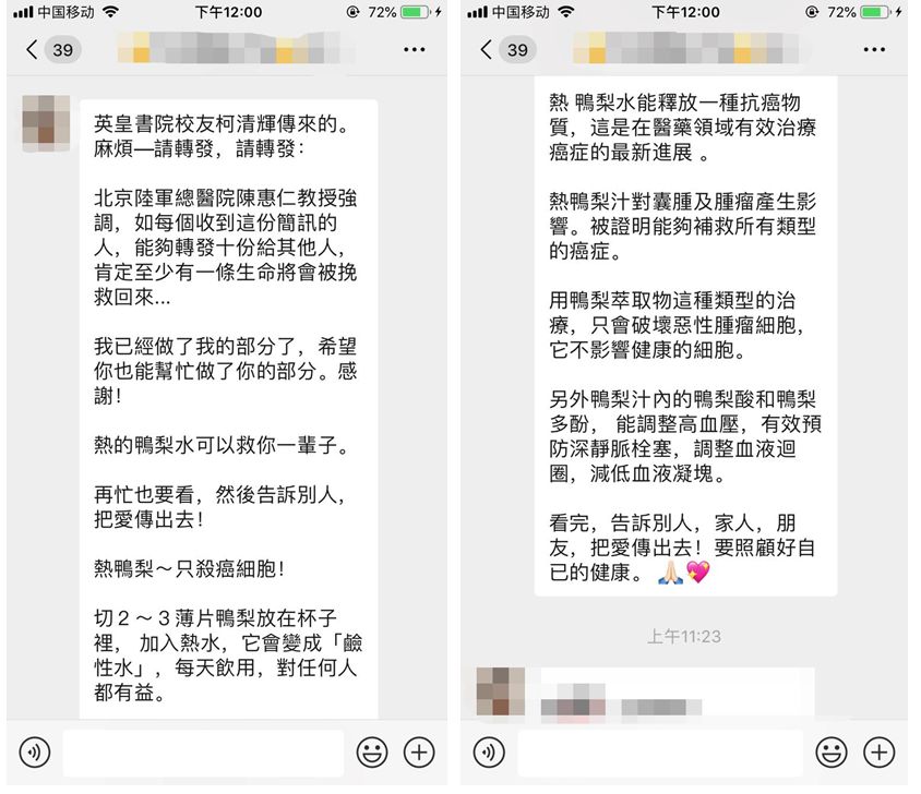 甚至有些谣言,直接点名道姓,信源更精确了,可信度再上一个 level。例如下面这则谣言,“北京陆军总医院陈惠仁教授”强调热鸭梨能杀癌细胞。