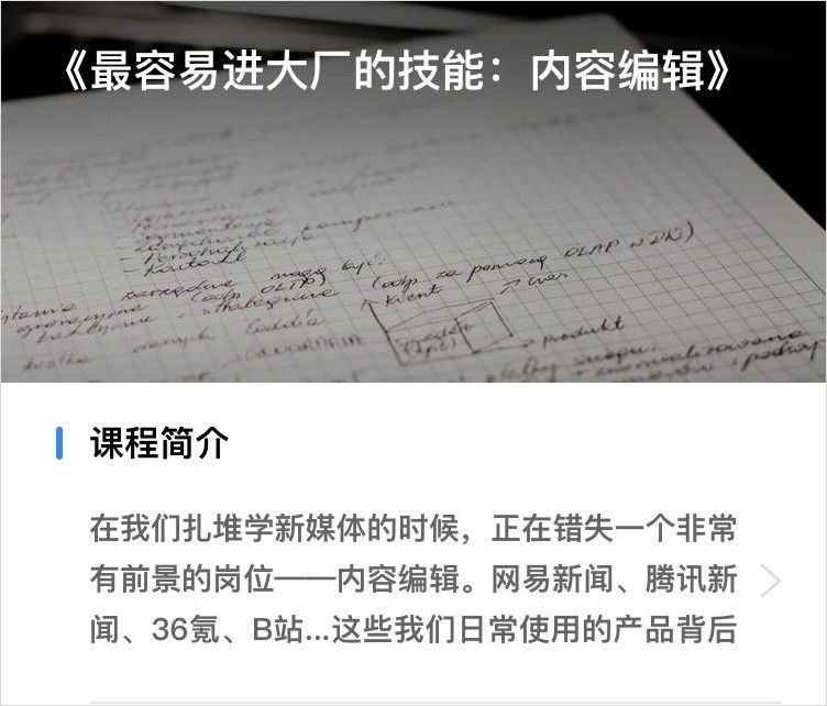 像运营研究社在推广内容编辑课程时,结合了小伙伴们想进大厂工作的痛点写的文案: