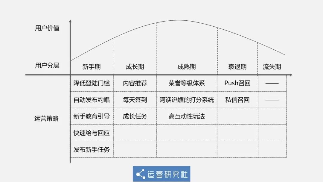 看到这里,你应该明白了全民 K 歌为什么会让大爷大妈们沉迷了吧,全民 K 歌对处在不同生命周期的用户,有着不同的运营目标和手段。