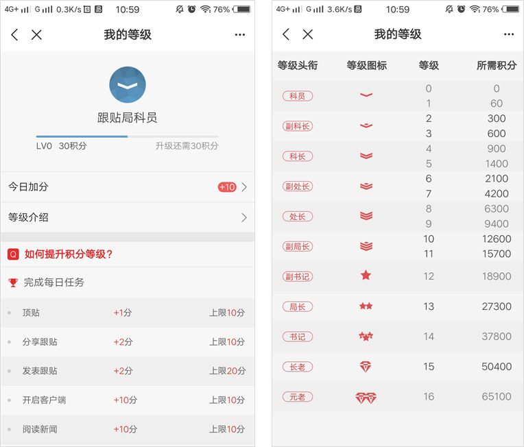 同样没有权益只有称号的等级体系还有网易新闻客户端,将用户等级定义为“跟帖局” 从科员到元老 11 个头衔 16 个等级,每个等级都有不同的图标。虽然这些等级的权益没什么不同,但是等级高的称号,总是用户们所向往的,这也是荣誉激励的一种方式。