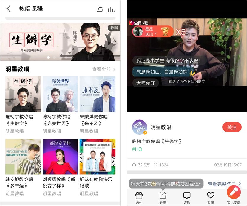 比如《生僻字》的创作者陈柯宇,在明星教唱这个板块,给用户讲解《生僻字》背后的故事,当然更主要的是告诉大家唱这首歌的正确姿势,引导用户发布作品。
