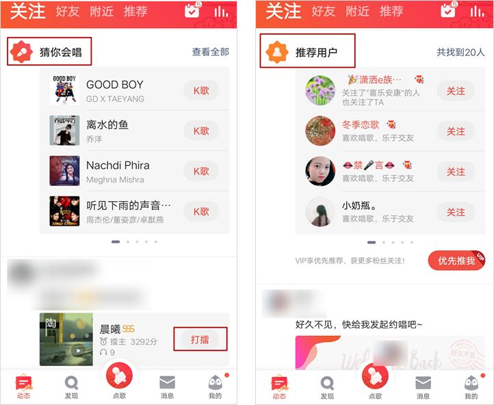 首页有用户推荐,好友作品,猜你会唱等。可以说首页上的每一个板块,都是为了让用户相互之间快速建立起社交关系,并进行互动。