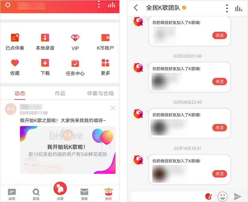 首页的内容推荐,让用户之间产生连接;每天签到和成长任务的设定,是为了培养用户的使用习惯,但是这还远远不够。对于内容型产品来说,当用户渡过成长期来到成熟期后,运营的关键就是让用户在平台上产生内容,并加强与其他用户之间的互动。那么对这个阶段的用户,全民 K 歌都做了什么?