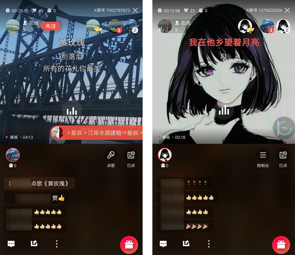 我妈说了,一起参加线上 K 歌的人水平都差不多,唱的都很难听,没有人会嫌弃谁,反而还会互相鼓励、赞美、送花送礼物等。
