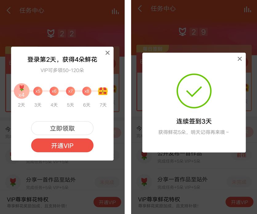 为了让用户连续登陆平台,全民 K 歌有一个每天签到领花功能,用户连续登陆的天数越多获得鲜花的数量就越多。