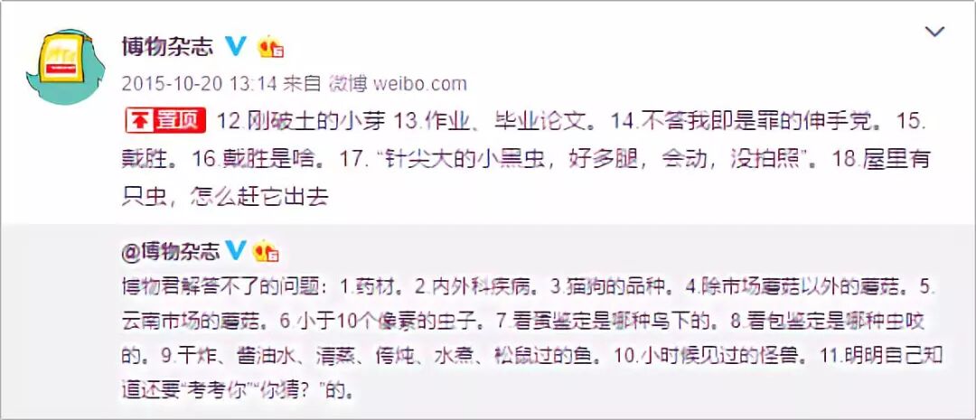 后来,这种“艾特提问+转发回答”的形式成了博物科普的主要形式,根据今天的热门微博统计来看,问答形式占比达到了 80% 甚至更高。