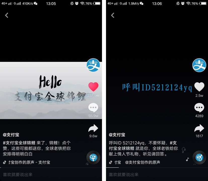 而在抖音开展的“支付宝全球锦鲤”活动,不仅原视频转赞评不到 300 万,新锦鲤抖音涨粉不到 5 千,基本上没有掀起什么波澜。