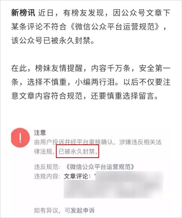 比如,新榜 2 月 25 日发布的文章中列举了系列封号的原因,其中一项便是精选留言不慎,造成公众号被永久封禁。