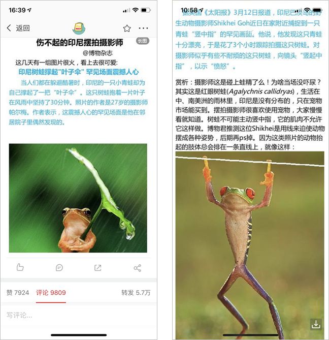 比如《伤不起的印尼摆拍摄影师》,起因是印尼摄影师以摆拍的形式,拍摄了一系列看上去很萌的照片,博物从谴责的角度“赏析”这些照片,告诉网友这些照片实际上是怎么拍的。该微博转发了 5.7 万,据说让粉丝数量翻了倍,突破了 10 万。