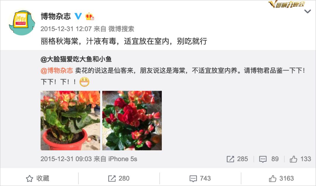 最后,博物才发现了真正符合自己的人设——“高冷”。没错,就是用精简的语言、淡定的语气告知关键信息。比如这个“丽格秋海棠”的科普,简短的“汁液有毒,适宜放在室内,别吃就行”,效果就非常好,而关于“吃”的回答完全戳中了粉丝的痒点。