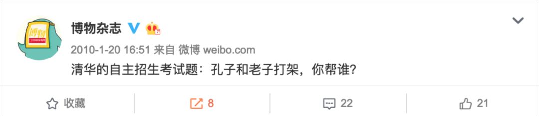 第三种是相对有趣的内容,但是基本上跟“博物”没什么关系的内容,而且微博上的同质化内容也相对较多,比如清华大学的自主招生考题,“孔子和老子打架 ,你帮谁?”等等。