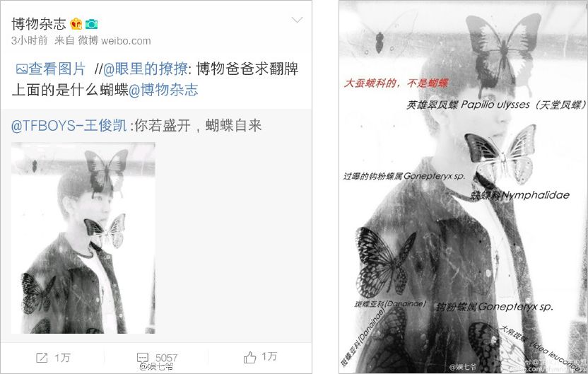 比如说,之前王俊凯发了一条带有很多蝴蝶的微博,有粉丝艾特博物问上面是什么蝴蝶。博物简单粗暴回了一张图,回答其中蝴蝶的类型,结果其中还有一只是蛾,并非蝴蝶,引起了大量粉丝传播。