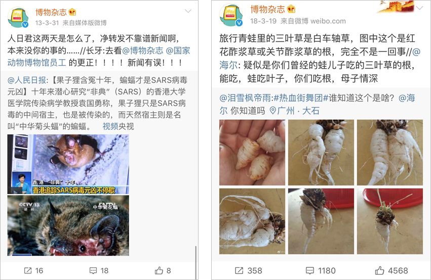 此外,博物还经常会对大 V 们转发的内容进行辟谣,连人民日报都被纠正过不少错误,还有海尔君蹭旅行青蛙热点时,就被纠错了等等。