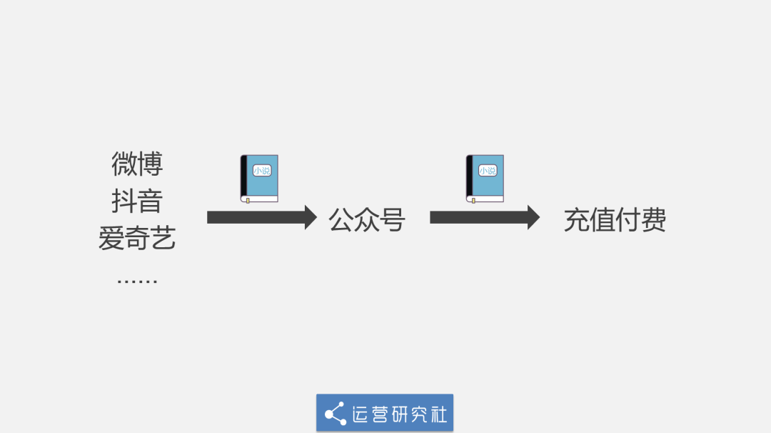 这就是小说分销的模式,简单来说,就是利用小说,把用户从微博、抖音等社交平台或是社群导流到公众号,然后再引导用户充值付费。