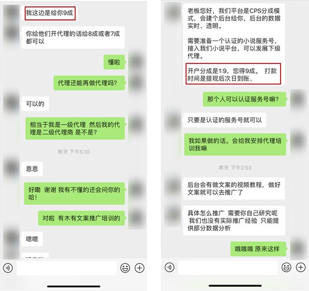 通过前期高额分成吸引分销人员,手把手教你推广技巧,还有的提供专门培训,让你觉得这个行业的钱很好赚,后期通过“扣量”的手段攫取收益;还有的小说平台可能布局整条灰色产业链、一条龙式收割用户。