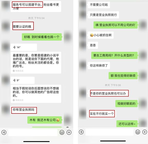 在跟和很多平台聊的时候,因为我发现一些平台会借帮你开服务号名义,推广其他业务,业务主要有公众号买卖,代办营业执照等。