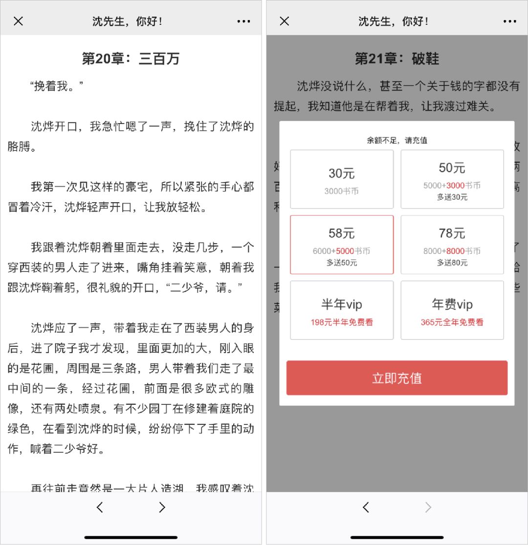 这些小说点开都可以直接看,但是,同样的套路,当我们看到高潮时,哎,充值链接又来咯。