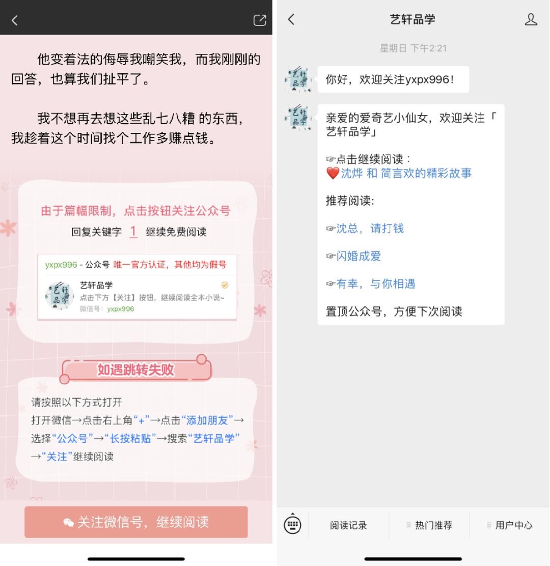 而且,他们都有一个共同的套路,最后一定都会引流到公众号。我在爱奇艺的信息流广告里找了一篇小说,根据提示关注了公众号。