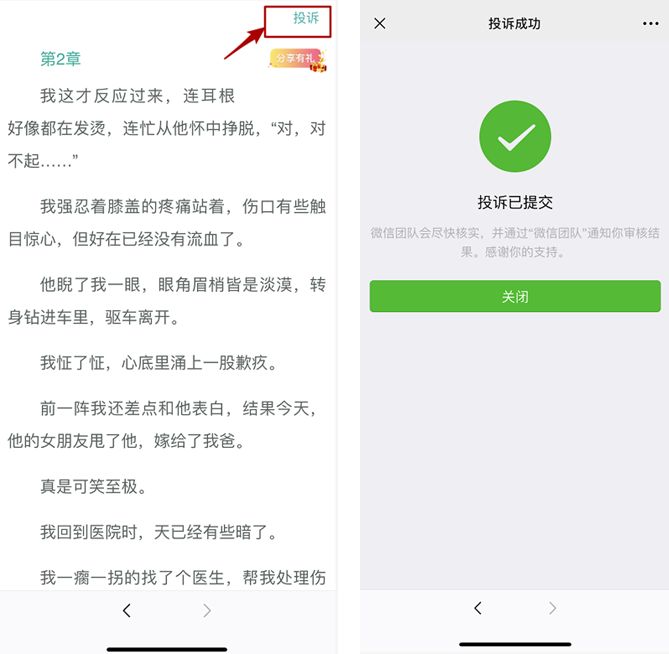 更鸡贼的是,你会发现小说的每一页都有一个特别明显的“投诉”通道,按理来说这种类型的小说不知道被投诉多少回了,事实上也应该是这样,我就投诉了好几次,然而并没有等到微信爸爸的回应。