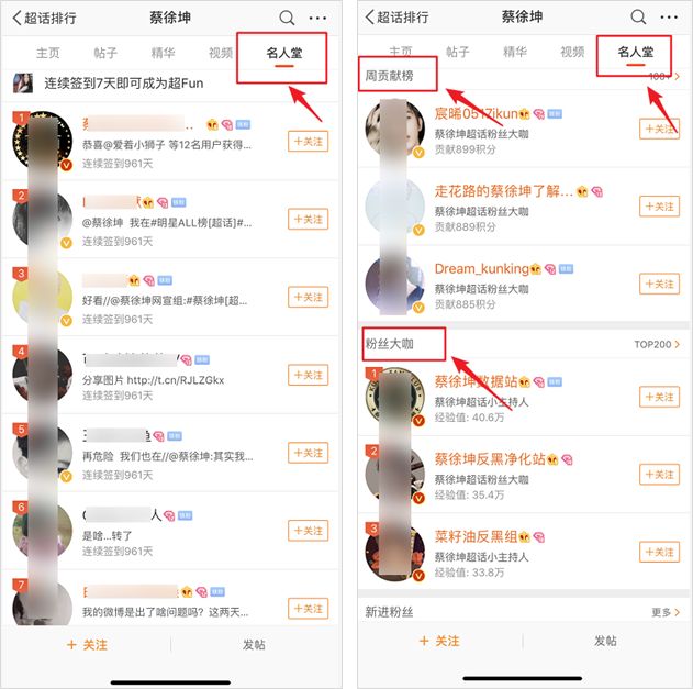 更鸡贼的是,超话中还有一个栏目是“名人堂”,里面有周贡献榜、粉丝大咖等分类。其实就是让粉丝形成内部竞争机制,多“打榜”、多发帖、坚持签到。